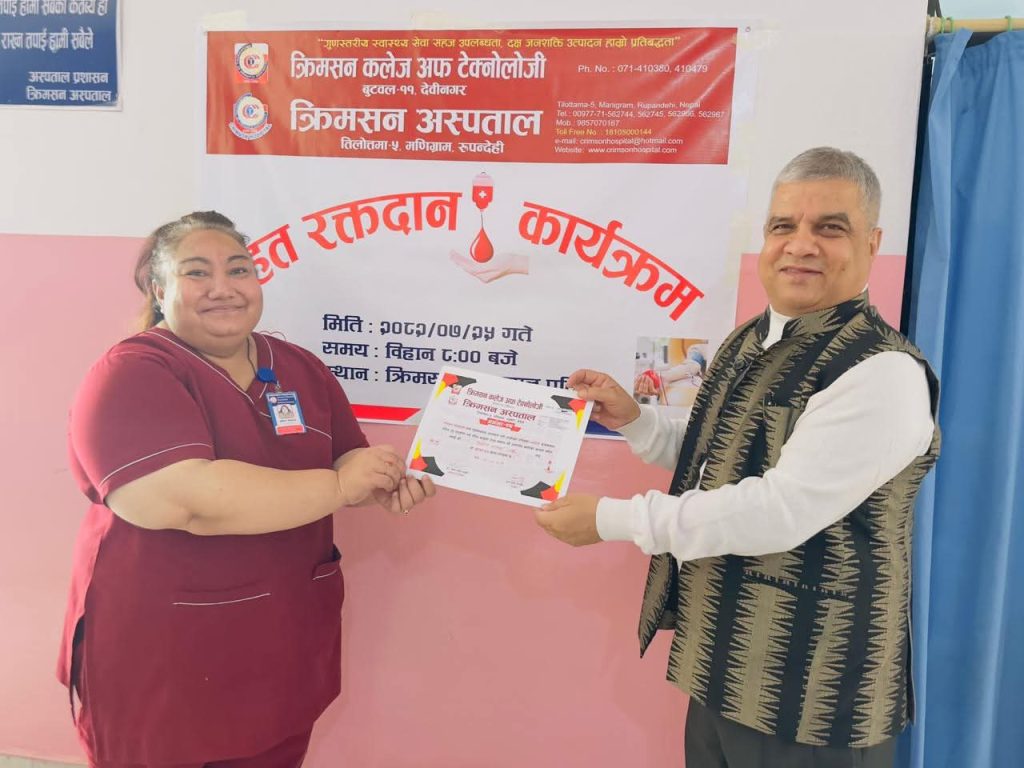 `रक्तदान जीवनदान’ भन्ने नाराका साथ क्रिमसन कलेज अफ टेक्नोलोजी क्रिमसन अस्पताल मणिग्रामले मंगलबार रक्तदान कार्यक्रमको आयोजना गरेको छ ।