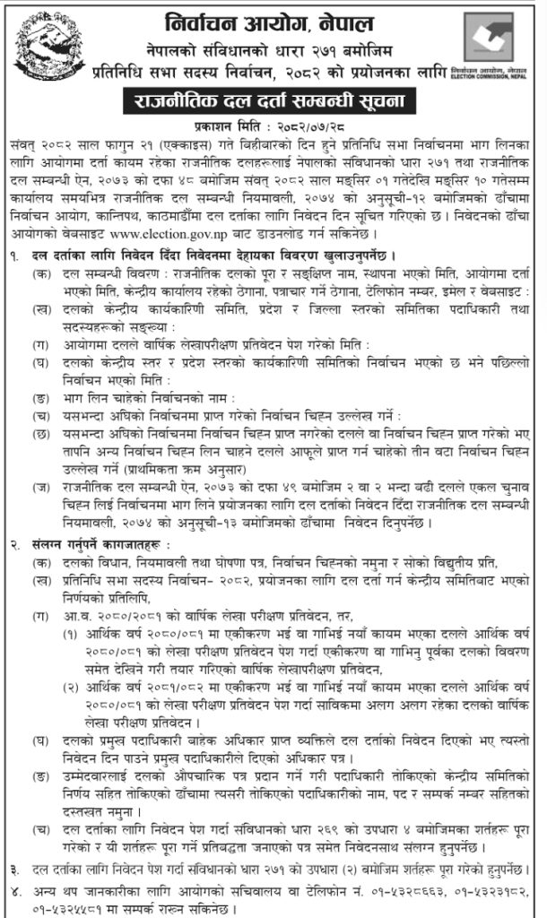 आयोगले आज सूचना निकालेर प्रतिनिधिसभाका लागि मङ्सिर १ देखि १० गतेसम्म र राष्ट्रियसभाका लागि मङ्सिर १ देखि ७ गतेसम्म दल दर्ता खुला गरेको जनाएको छ ।