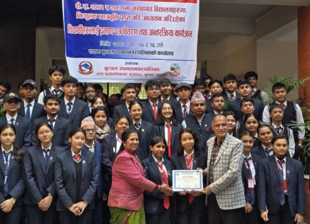 बुटवलका संस्थागत विद्यालयहरुमा छात्रबृत्ति पाएर अध्ययन गरिरहेका विद्यार्थीहरुलाई प्रमाणपत्र प्रदान गरिएको छ । बुटवल उपमहानगरपालिकाले २०८१ सालमा छात्रावृत्ति प्राप्त गरिरहेका संस्थागत विद्यालयमा निःशुल्क अध्ययन गरिरहेका ३३९ जना विद्यार्थीहरुलाई सोमबार प्रमाणपत्र प्रदान गरेको हो । सो अवसरमा उपमहानगरले छात्रबृत्तिमा अध्ययन गरिरहेका विद्यार्थीहरुसँग अन्तरक्रिया समेत गरेको छ ।