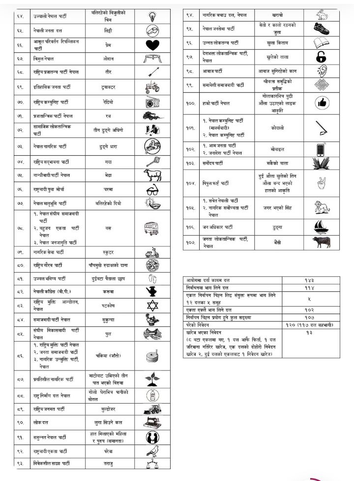 आइतबार आयोगले चुनावमा भाग लिन दर्ता भएका ११४ दललाई एकल र संयुक्त चुनाव चिह्न प्रदान गरेको हो । आयोगमा हाल १४३ दलको दर्ता कायम रहेपनि निर्वाचनमा ११४ दलले भाग लिने जनाएको छ ।