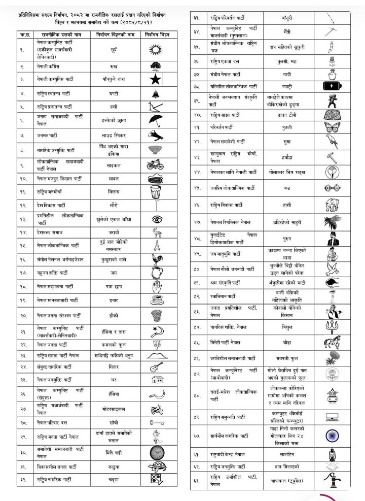 निर्वाचन आयोगले आगामी फागुन २१ मा हुने प्रतिनिधिसभा निर्वाचनका लागि दलहरुलाई चुनाव चिह्न वितरण गरेको छ ।
