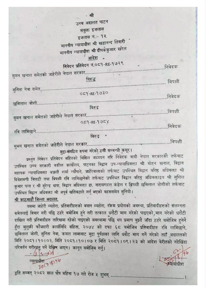 गत २ माघ २०८१ मा जिल्ला अदालत काठमाडौंले लामिछानेलाई ६० लाख रुपैयाँ धरौटीमा छाड्न आदेश दिएको थियो ।
