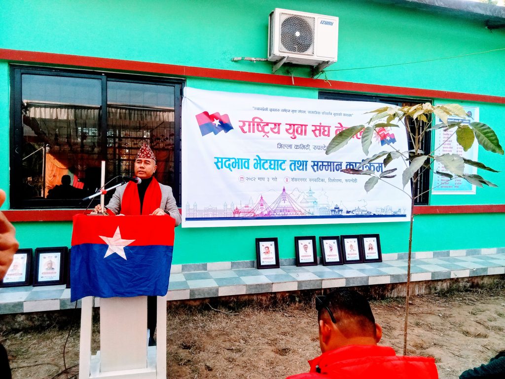 राष्ट्रिय युवा संघ नेपाल रूपन्देहीले आयोजना गरेको भेटघाट तथा सम्मान कार्यक्रममा वोल्दै वक्ताहरुले नेकपा एमाले देश र जनताको विकास र सम्वृद्धिमा सधै अगुवाइ गर्ने पार्टी भएकोले आगामी निर्वाचनमा सवै भन्दा ठूलो पार्टी बन्ने विश्वास रहेको वताएका छन्।