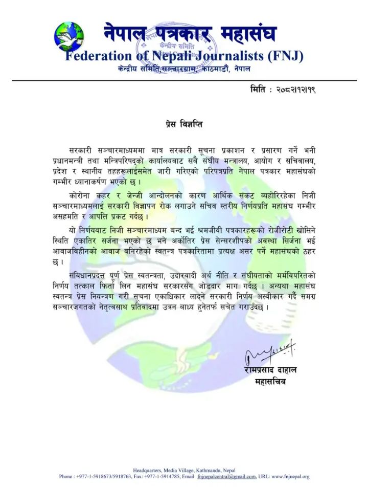 नेपाल पत्रकार महासङ्घले तत्कालै विज्ञप्ति जारी गर्दै निर्णय फिर्ता लिन सरकारसँग माग गरेको छ । महासङ्घका महासचिव रामप्रसाद दाहालद्वारा जारी विज्ञप्तिमा यसलाई “मिडियामाथिको आर्थिक नाकाबन्दी” को संज्ञा दिएको छ । विज्ञप्तिमा भनिएको छ, “सरकारले सूचना प्रकाशनको अवसर एकै सरकारी संस्थामा केन्द्रित गर्नु प्रेस स्वतन्त्रताको मर्म विपरीत छ र यसले प्रतिस्पर्धात्मक मिडिया वातावरणलाई कमजोर बनाउँछ ।”