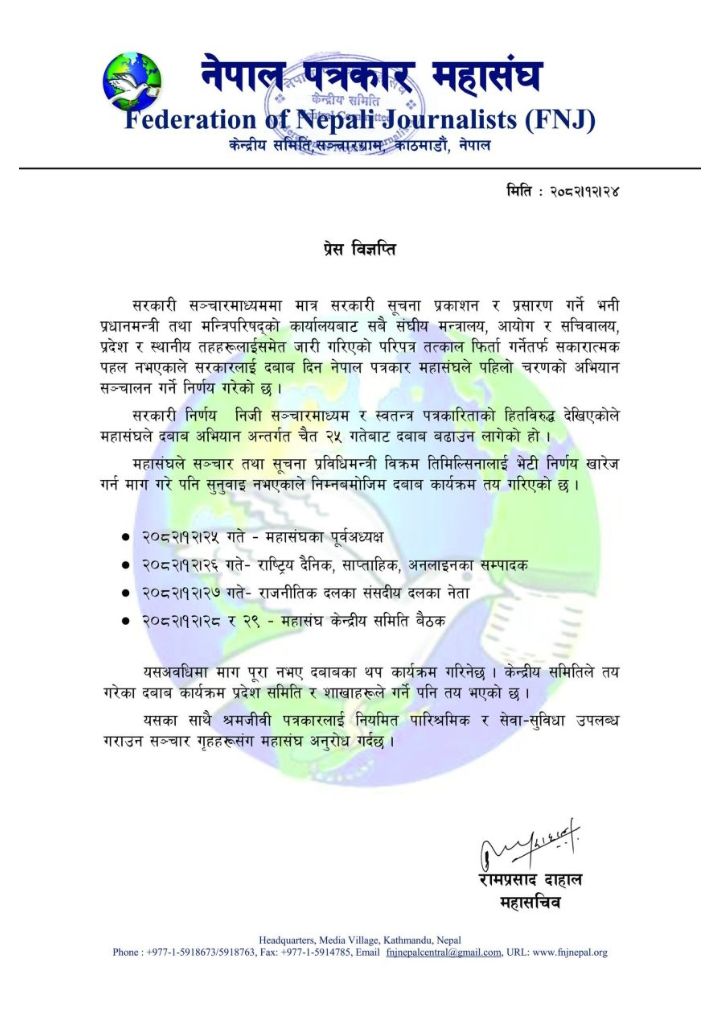 नेपाल पत्रकार महासङ्घले निजी सञ्चारमाध्यमलाई विज्ञापन नदिने सरकारी निर्णयप्रति असन्तुष्टि जनाउँदै दबाब सिर्जना गर्न पहिलो चरणको अभियान सुरु गर्ने निर्णय गरेको छ। प्रधानमन्त्री तथा मन्त्रिपरिषद्को कार्यालयले सरकारी सूचना केवल सरकारी सञ्चारमाध्यममार्फत मात्र प्रकाशन तथा प्रसारण गर्न निर्देशन दिएको भन्दै महासङ्घले उक्त परिपत्र तत्काल फिर्ता गर्न माग गरेको छ।