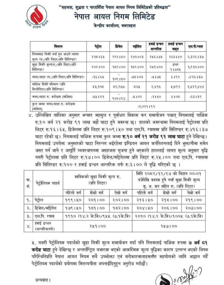निगमका अनुसार सरकारले ५० प्रतिशत भन्सार छुट र पूर्वाधार विकास करमा छुट दिएको अवस्थामा समेत पाक्षिक रूपमा करिब १० अर्ब २१ करोड ९१ लाख रुपैयाँ घाटा हुने अवस्था रहेको छ। हाल निगमलाई पेट्रोलमा प्रतिलिटर १६.६५ रुपैयाँ, डिजेलमा १०९.५ रुपैयाँ र एलपी ग्यासमा प्रति सिलिन्डर ४१६.३७ रुपैयाँ घाटा रहेको जनाएको छ।
