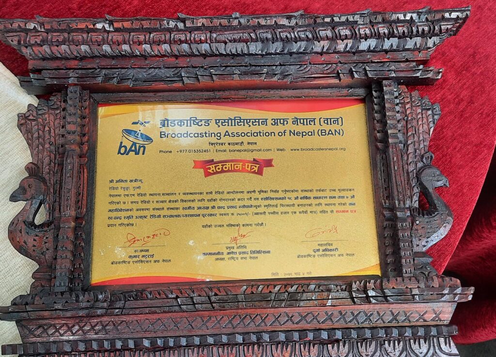 ४ भदौ, बुटवल । कुनै पनि पेशा व्यवसायमा निरन्तररुपमा मेहनत गर्ने हो भने सफलता अबश्य प्राप्त गर्न सकिन्छ जसको उदाहरण हुन् गुल्मीकी पत्रकार अनिता खत्री । खत्रीे निजी रेडियोहरुको छाता संस्था ब्रोडकाष्टिङ् अफ नेपाल (वान)द्धारा उत्कृष्ट छनौट भएकी छिन् । उनी अहिले देशभरका सयौ रेडियोबाट उत्कृष्ट छनोट भएकी हुन । गुल्मी जिल्लाको पहिलो रेडियो, रेडियो रेसुङ्गा एफ.एम.१०६.२ मेगार्हजमा स्टेशन म्यानेजरको रुपमा कार्यरत अनिता खत्रीलाई बानले १८ औं वार्षिक साधारणसभा तथा सातौं महाधिवशेनको अवसरमा सम्मानित गरेको हो । रेडियो र सञ्चार क्षेत्रको विकासको लागि पुर्याएको योगदानको कदर गर्दै (वान)ले सम्मान गरेको हो । नेपालमा एफ.एम रेडियो स्थापना, सञ्चालन र व्यवस्थापनका साथै रेडियो आन्दोलनमा अग्रणी भूमिका निर्वाह गरेको भन्दै संस्थाको तर्फबाट उच्च मूल्याङकन् गर्दै खत्रीलाई सम्मान गरिएको वानले जनाएको छ ।