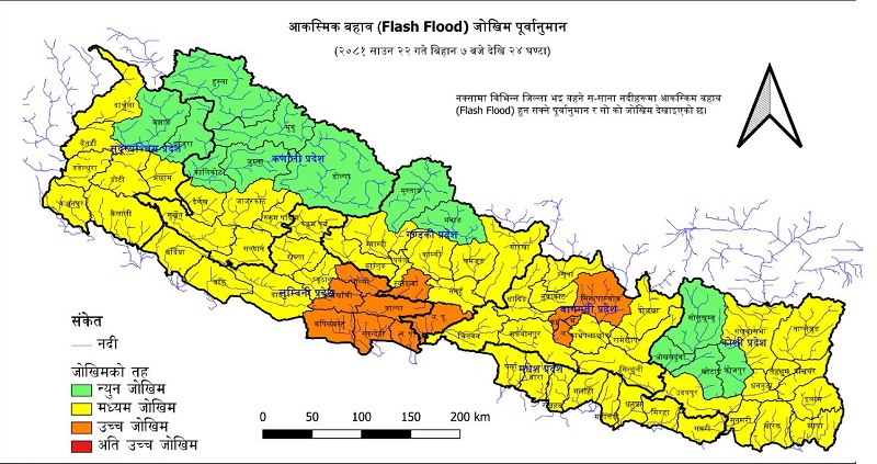 काठमाण्डौ – निरन्तरको वर्षाले विभिन्न क्षेत्रका नदी तथा खोलामा पानीको बहावसँगै जोखिम बढेको छ । काठमाण्डौमा विष्णुमती नदीको गोङ्गबु जलमापन केन्द्रमा जलसतहले सतर्कता तह पार गरेको र बढ्दो क्रममा रहेको बाढी पूर्वानुमान महाशाखाले जनाएको छ ।महाशाखाले नदी तटीय क्षेत्र आसपास बस्ने र नदी किनार भई यात्रा गर्नेहरूलाई दिउँसो २ बजेसम्म उच्च सतर्कता अपनाउन आग्रह गरेको छ । यस्तै ललितपुरको गोदावरी नगरपालिकामा रहेको खोड्कु खोला झरुवाराशी जलमापन केन्द्रमा पनि जलसतह सतर्कता तह पार गरेको र बढ्दो क्रममा रहेको छ । त्यस क्षेत्रमा नदी तटिय क्षेत्रमा बाढीको जोखिम रहेकोले दिउँसो २ बजे सम्मै उच्च सतर्कता अपनाउन महाशाखाको आग्रह छ । यसैबीच, आज सिन्धुपाल्चोक, काठमाण्डौ, ललितपुर, भक्तपुर, पाल्पा, स्याङ्जा, गुल्मी, अर्घाखाँची, नवलपरासी ( पूर्व), नवलपरासी ( पश्चिम), रुपन्देही, कपिलवस्तु र आसपासका जिल्ला भई बहने केही स–साना नदीहरुमा बहाव बढ्ने तथा केही स–साना नदीमा आकस्मिक बहावको उच्च जोखिम रहने पूर्वानुमान रहेको छ ।यस क्षेत्रका मेलम्ची, बाग्मती, बिष्णुमती, धोबि खोला, हनुमन्ते खोला, कालिगण्डकीको सहायक नदीहरू, तिनाउ, बाणगंगा, कञ्चनखोला, दानो खोला लगायतका नदीमा आकस्मिक बहावको उच्च जोखिम रहेकाले सतर्कता अपनाउन महाशाखाको अनुरोध छ ।आज र भोलि तमोर, अरूण, तिनाउ, बाग्मती, कमला, नारायणी, कालीगण्डकी, मर्स्याङदी, बबई, पश्चिम राप्ती र यसका सहायक नदीहरुमा जलसतह सतर्कता तह आसपास हुने पूर्वानुमान रहेकोले नदी तटिय क्षेत्रमा उच्च सतर्कता अपनाउन बाढी पूर्वानुमान महाशाखाले अनुरोध गरेको छ ।
