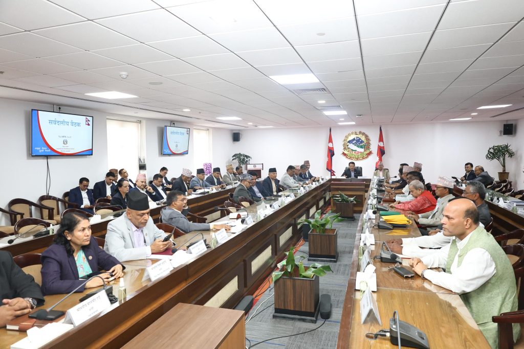 काठमाडौँ । कार्यबाहक प्रधानमन्त्री प्रकाशमान सिंहले बोलाएको सर्बदलीय बैठक सिंहदरबारस्थित प्रधानमन्त्री तथा मन्त्रिपरिषद्को कार्यालयमा बस्यो ।