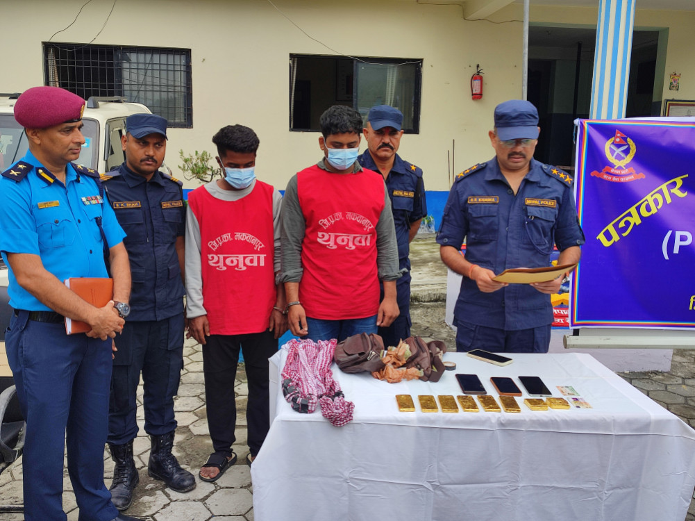 जिल्ला प्रहरी कार्यालय मकवानपुरले ८ किलोग्राम अवैध सुनसहित २ जनालाई पक्राउ गरेको छ । प्रहरीले शनिबार बिहान पत्रकार सम्मेलन गर्दै हेटौंडा-१५ स्थित रातोमाते प्रहरी चौकीबाट ८ केजी २४३ ग्राम ९७० मिलिग्राम अवैध सुनसहित उनीहरुलाई सार्वजनिक गरेको हो ।
