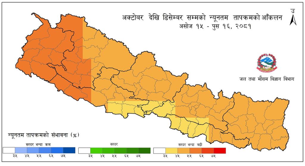 विभागले यस वर्षको अक्टोबरदेखि डिसेम्बरसम्म (असोज १५ देखि पुस १५ गतेसम्म)को तीन महिनाको अवधिमा अधिकतम र न्यूनतम तापक्रम देशभर सरदरभन्दा बढी हुने प्रक्षेपण सार्वजनिक गरेको छ । ‘यसको मतलब दिउँसो र राति दुवै समयको तापक्रम सरदरभन्दा बढी भई गर्मी हुने भनेको हो,’ विभागकी वरिष्ठ मौसमविद डा. इन्दिरा कँडेलले प्रष्ट्याइन् ।