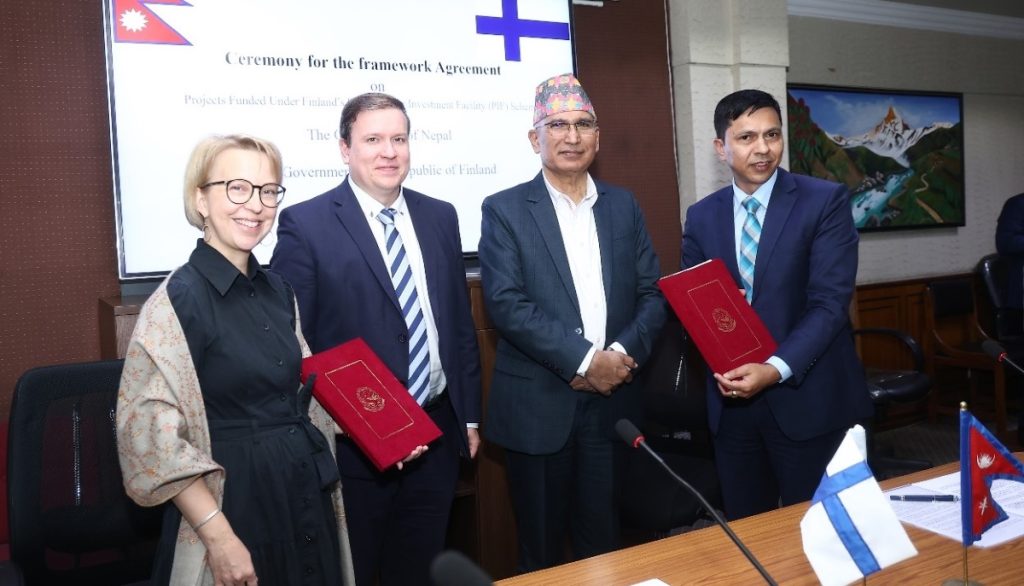 फिनल्याण्डको सार्वजनिक लगानी सुविधा योजनाअन्तर्गत वित्त परिचालन हुने परियोजनाको सम्झौतामा अर्थ मन्त्रालयका अन्तर्राष्ट्रिय आर्थिक सहायता समन्वय महाशाखा प्रमुख धनीराम शर्मा र नेपालका लागि फिनल्याण्डका राजदूत रिना रिक्का हेइकाले हस्ताक्षर गरेका हुन् । यो सम्झौताको नेपालमा सामाजिक–आर्थिक पूर्वाधार सुदृढ गर्न र दिगो विकासलाई प्रोत्साहन गर्न परियोजनामा आधारित सहुलियतपूर्ण वित्तिय परिचालन गर्ने लक्ष्य रहेको छ ।