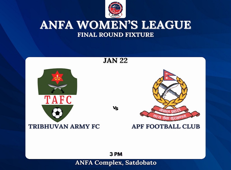 काठमाण्डौ – एन्फा महिला लिग फुटबलमा आज शीर्ष स्थानको सशस्त्र प्रहरी बलको एपीएफ क्लब र दोस्रो स्थानको त्रिभुवन आर्मी क्लब खेल्दैछन् ।
