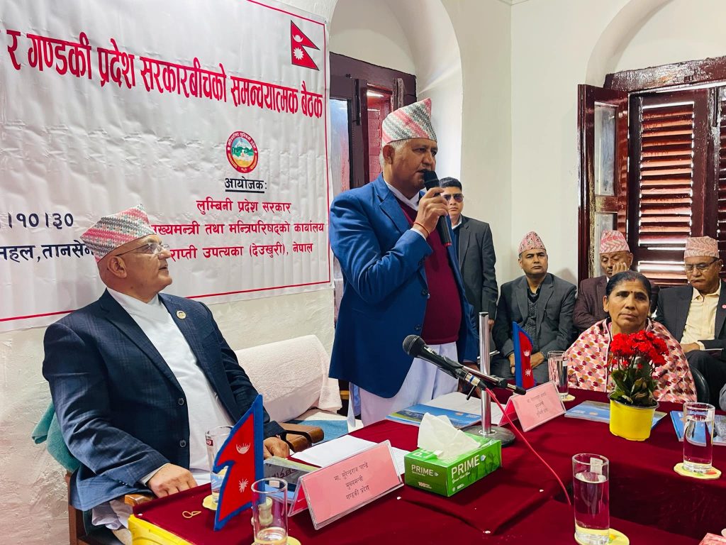 नेपालको संविधानको धारा ५६ अनुसार राज्यशक्तिको बाँडफाँड, सङ्घीय ढाँचाको शासकीय अभ्यास तथा तीन तहका सरकारबीच समन्वय, सहकार्य र सहअस्तित्वको मर्मलाई आत्मसात् गर्दै लुम्बिनी र गण्डकी प्रदेश सरकारबीचको पहिलो ऐतिहासिक बैठक पाल्पाको रानीमहलमा सम्पन्न भएको हो । उक्त बैठकमा दुवै प्रदेशका साझा सम्भावनालाई सम्बोधन गर्ने तथा प्रदेश सरकारलाई जनताको अझ नजिक पु¥याउने उद्देश्यका साथ विभिन्न महत्वपूर्ण निर्णयहरू गरिएका छन् ।