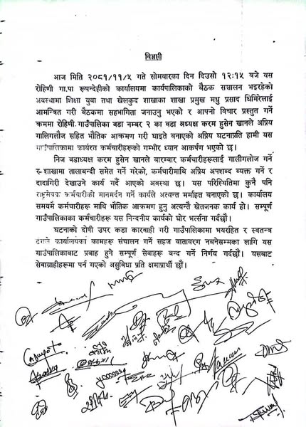 रुपन्देही । रुपन्देहीको रोहिणी गाउँपालिकामा कार्यरत कर्मचारीहरूले गाउँपालिकाको कार्यपालीको बैठकका क्रममा शाखा प्रमुखमाथि भएको भौतिक आक्रमणको विरोध गर्दै दोषीलाई कारबाही नभएसम्म सम्पूर्ण सेवा बन्द गर्ने निर्णय गरेका छन्।