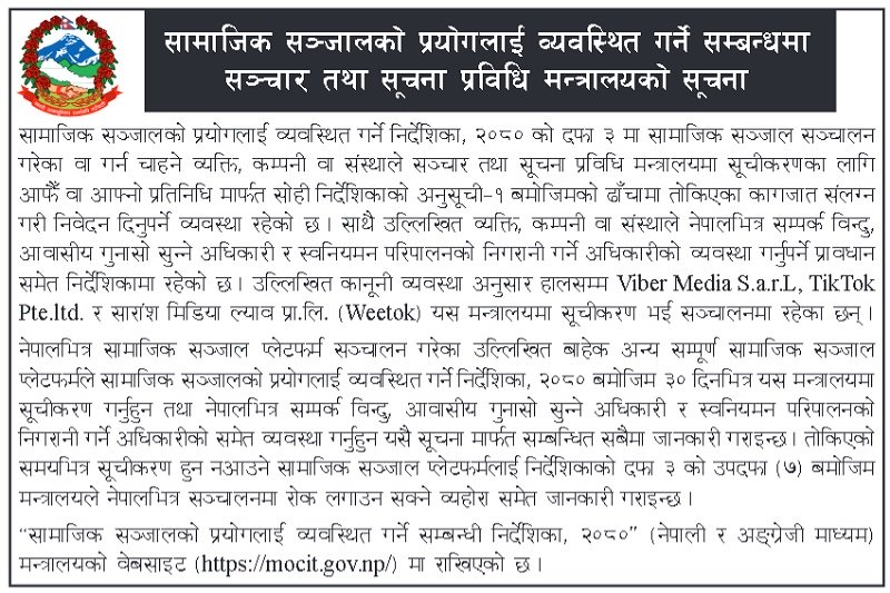 सञ्चार तथा सूचना प्रविधि मन्त्रालयले सबै सामाजिक सञ्जाल प्लेटफर्मले अबको ३० दिनभित्र सूचीकरण गराउन, नेपालभित्र सम्पर्क विन्दु, आवासीय गुनासो सुन्ने अधिकारी र स्वःनियमन परिपालनाको निगरानी गर्ने अधिकारीको समेत व्यवस्था गर्न सचेत गराएको हो । तोकिएको समयभित्र सूचीकरण हुन नआउने सामाजिक सञ्जाल प्लेटफर्मलाई नेपालभित्र सञ्चालनमा रोक लगाउन सक्ने मन्त्रालयको सूचनामा उल्लेख छ ।