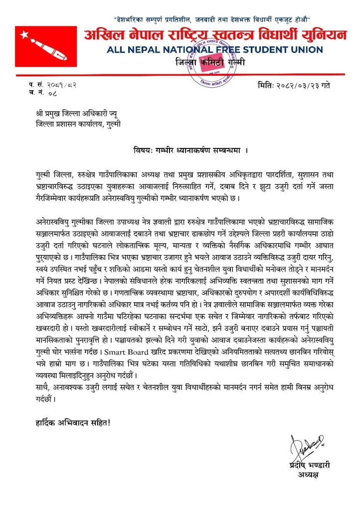 गुल्मी, असार २३: गुल्मी जिल्लाको रुरु गाउँपालिकामा व्याप्त भ्रष्टाचार, अनियमितता र अध्यक्ष तथा प्रमुख प्रशासकीय अधिकृतको गैरजिम्मेवार कार्यशैलीविरुद्ध अखिल नेपाल राष्ट्रिय स्वतन्त्र विद्यार्थी युनियन (अनेरास्ववियु) गुल्मीले सशक्त आन्दोलनको घोषणा गरेको छ। अनेरास्ववियु गुल्मीका अध्यक्ष प्रदीप भण्डारीद्वारा हस्ताक्षरित एक विज्ञप्ति जारी गर्दै भ्रष्टाचारमा संलग्न दोषीलाई कारबाहीको माग गरिएको छ।