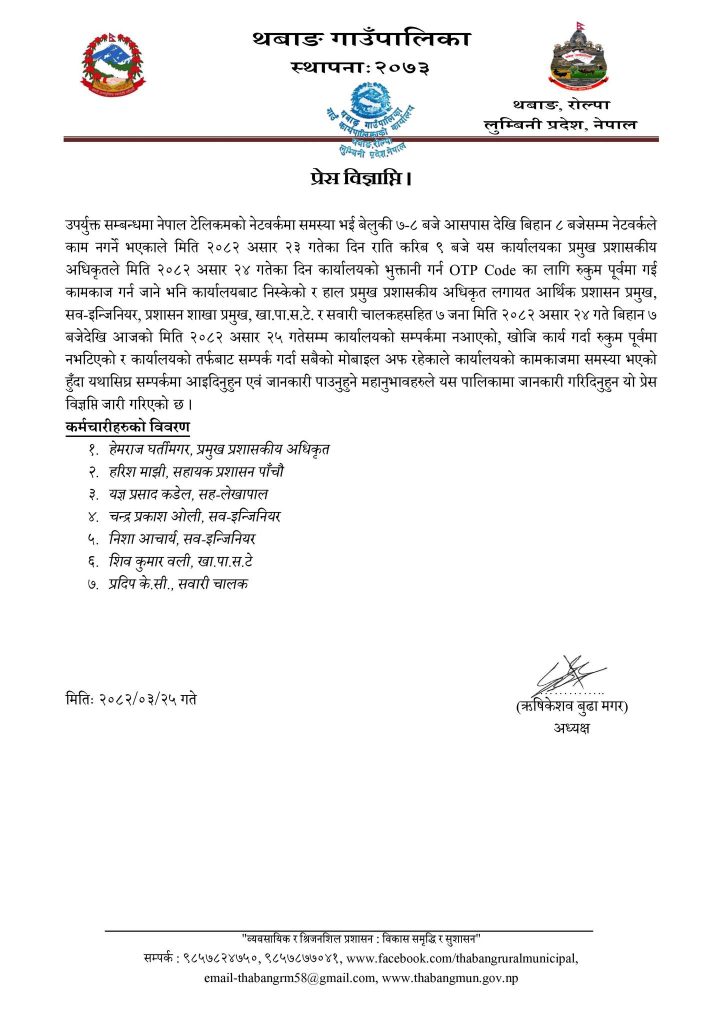 २४ गते बिहान कार्यालयमा मोबाइल नेटवर्क नआएको भन्दै गाडी चढेर रुकुम पूर्वतर्फ हिँडेका प्रमुख प्रशासकीय अधिकृत हेमराज घर्तीमगरसहितका कर्मचारी मंगलबार र बुधबार सम्पर्कविहीन भएका थिए। कर्मचारी सम्पर्कमा नआएपछि पछि गाउँपालिकाकाले बुधबार सूचना निकालेको थियो ।