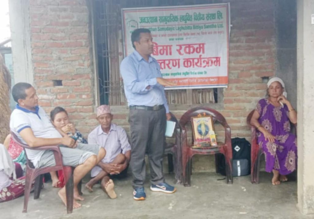हरेक सदस्यहरुले लिएको कर्जाको विमा गरिएको हुन्छ । त्यही विमा वापताको रकम हामीले मिनादेवीलाई दिएका हौँ संस्थाका कोलोनी इलाका संचालन कार्यलयका अधिकृत टोप बहादुर सुनारले भने । गत फागुन २५ गते बनगाई शाखामा धितो राखेर कर्जा लिनु भएको थियो । जेठ २९ गते श्रीमान्को असामयिक निधन भयो । कर्जा विमा वापतको रकम ४ लाख र काजक्रियाका लागि १५ हजार गरि ४ लाख १५ हजार हस्तान्तरण गरेको सुनारले भने ।