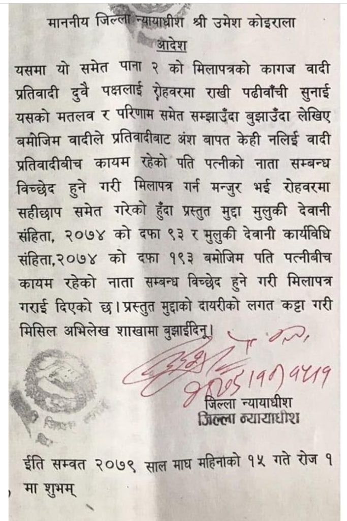 डा. थापाले २०७९ माघ १५ गते जिल्ला अदालत रुपन्देहीमा न्यायाधीश उमेश कोइरालाको इजलाशमा सम्बन्ध विच्छेद गरी मिलापत्र गरेको कागज सार्वजनिक गरेका हुन् ।डा. थापा रास्वपाबाट ९ जना आकांक्षीमध्येबाट उम्मेदवार बनेपछि उनीबारे बहुविवाहको समाचारहरु सार्वजनिक भएका थिए ।