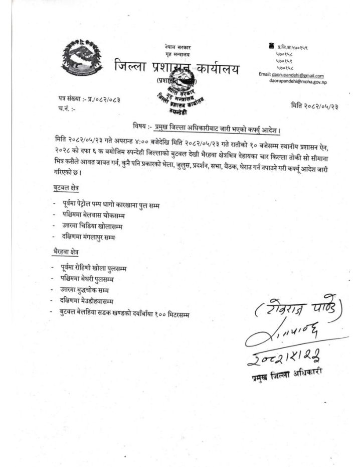 रुपन्देहीकाे बुटवलदेखि भैरहवा क्षेत्रभित्र आज अपरान्ह ४ बजेदेखि रातिको १० बजेसम्म कर्फ्यु जारी भएको छ ।
