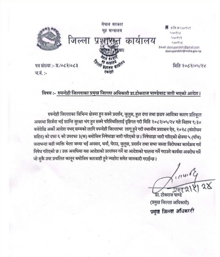 जिल्ला प्रशासन कार्यालय, रुपन्देहीले आज बिहान ९:३० बजेदेखि अर्को आदेश नभएसम्मका लागि निषेधाज्ञा लागू गरेको हो ।