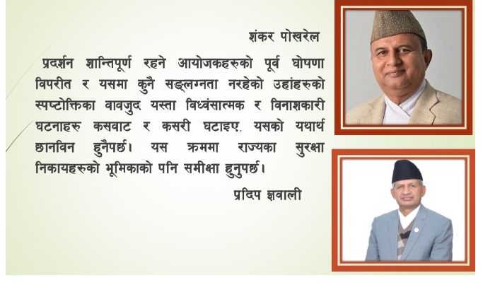 प्रदर्शन शान्तिपूर्ण रहने आयोजकहरुको पूर्व घोषणा विपरीत र यसमा कुनै सङ्लग्नता नरहेको उहाँहरुको स्पष्टोक्तिका बाबजुद यस्ता विध्वंसात्मक र विनाशकारी घटनाहरु कसबाट र कसरी घटाइए, यसको यथार्थ छानबिन हुनैपर्छ। यस क्रममा राज्यका सुरक्षा निकायहरुको भूमिकाको पनि समीक्षा हुनुपर्छ।